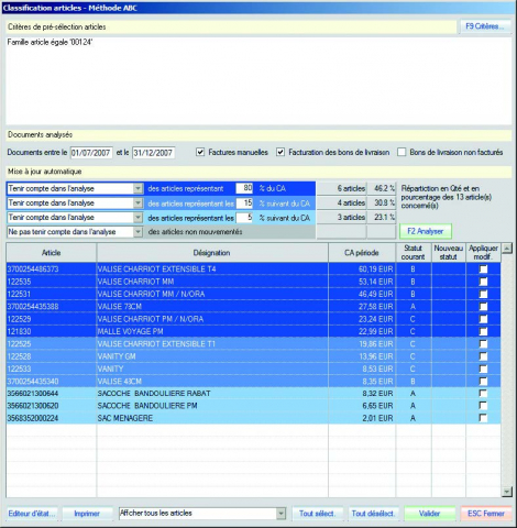 C’est une fonction qui permet de classer les articles selon la loi de Wilfredo Pareto, à savoir ceux qui réalisent 80% du chiffre d’affaires, puis ceux qui représentent les 15% suivant et enfin ceux qui contribuent pour les 5% restants. Vous visualisez le montant du CA réalisé sur l’article et vous pouvez alors adapter les comportements d’achat en modifiant le statut de l’article en fonction de ce classement.